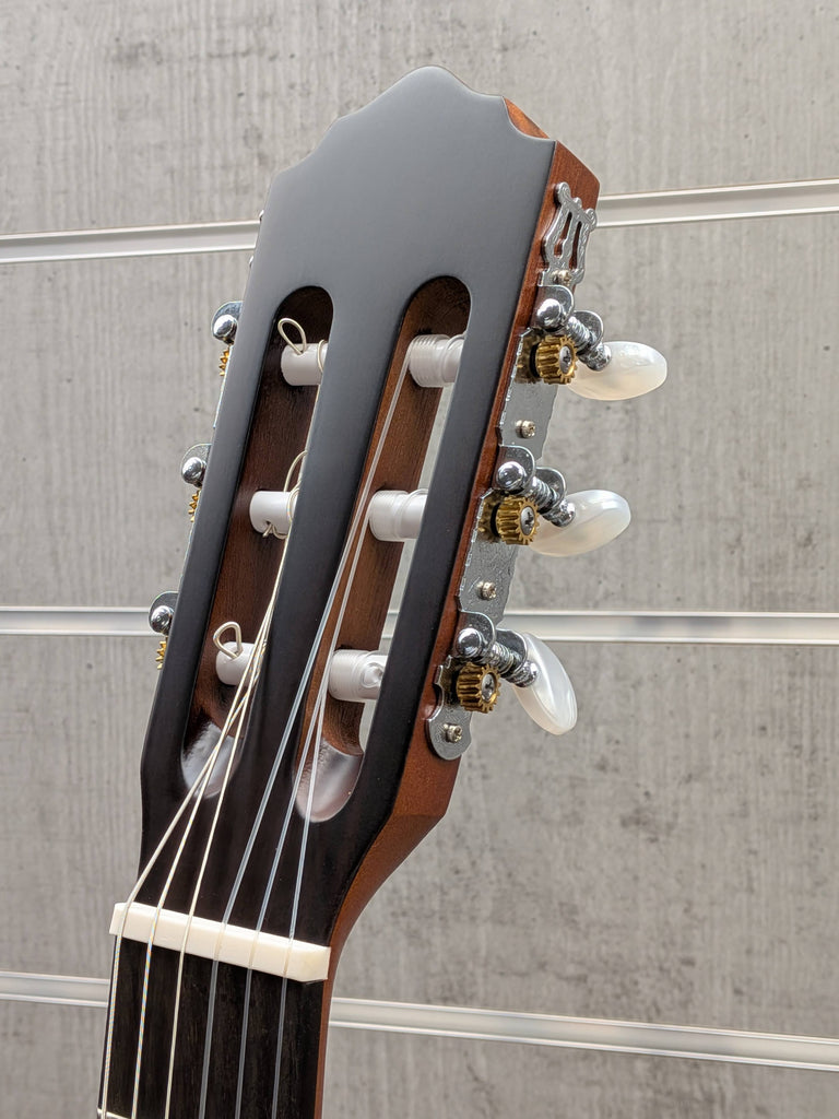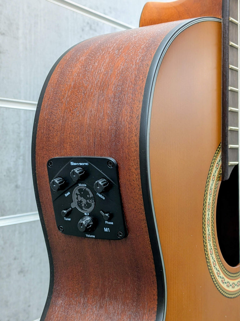 La tavola armonica in Abete Sitka regala un suono chiaro e brillante, mentre fasce e fondo in Sapele donano profondità e calore al timbro. La tastiera in Palissandro rende la suonabilità scorrevole e naturale, supportata da meccaniche cromate affidabili che mantengono stabile l’accordatura. Il tutto è rifinito con un’elegante finitura satinata Natural, piacevole anche al tatto.