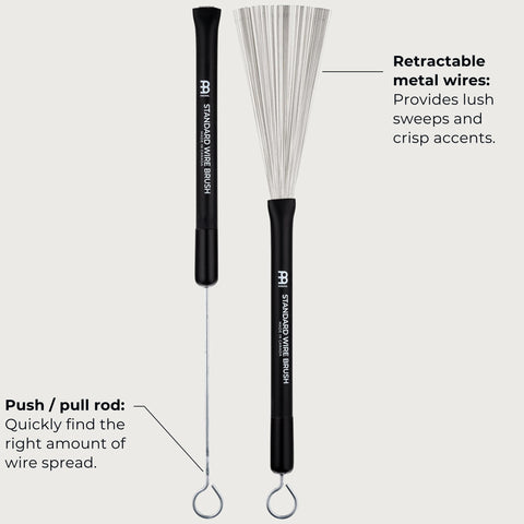 Le Meinl SB300 sono spazzole retrattili progettate per offrire versatilità e controllo in ogni situazione musicale. Il manico in materiale sintetico assicura una presa stabile e confortevole, mentre la possibilità di regolare la lunghezza delle setole metalliche consente di ottenere il tocco perfetto per ogni dinamica ed esigenza stilistica.